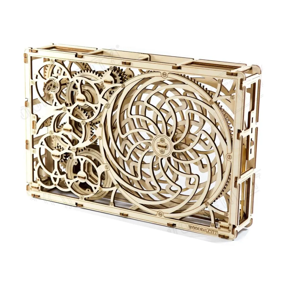 L’image cinétique est un puzzle 3D en bois, l’un des modèles de bois découpés au laser auto-assemblés les plus populaires. C’est une image «en direct » qui est activée par une touche. Vous verrez un mouvement sur tout le mécanisme! Les motifs tournent dans des directions opposées, créant de délicieuses illusions! Le dessin graphique de ses détails allie la précision mathématique à l’imagination artistique unique de son créateur. Une fois assemblée, l’image est activée avec une clé, et elle prend vraiment vie! Toutes les pièces commencent à tourner et à se déplacer. C’est fascinant! La partie centrale de l’image cinétique est comme un cadran d’horloge et son motif «danse de la vigne » ressemble au passage du temps. Son effet est magnétique. Regardez, et essayez de ne pas laisser vos yeux se déchirer! C’est un ornement fabuleux, et la couleur naturelle du bois s’intègre parfaitement dans tout design d’intérieur de style moderne de n’importe quelle pièce.