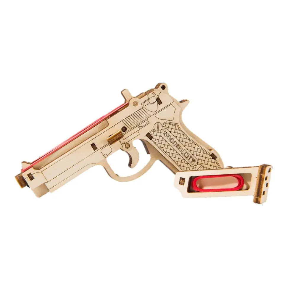 La vraie arme est faite pour les vrais hommes courageux! Si vous vous reconnaissez dans ces mots, notre nouveau pistolet Legend BRT-9 a été spécialement conçu pour vous. En plus du courage, vous devrez également appliquer de l’intelligence pour assembler ce modèle. Une nouveauté dans le monde des décors en bois auto-assemblés. Vous n’avez pas besoin de colle pour l’assemblage. Le modèle assemblé tire des cartouches spéciales sous forme d’élastiques. L’ensemble comprend 8 pièces. Cinq élastiques peuvent être tirés à la fois. Il y a aussi un fusible.