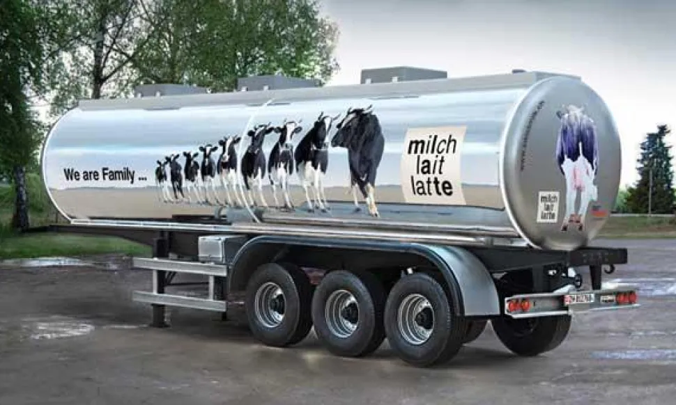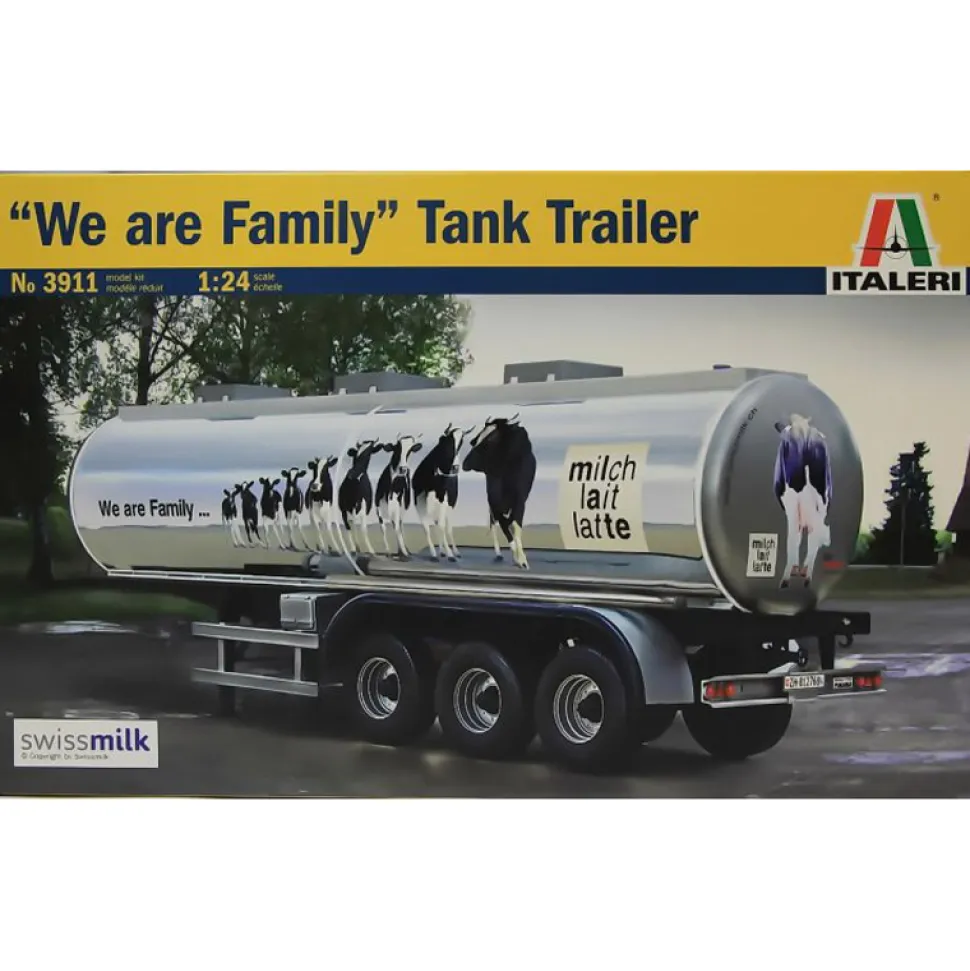 Maquette en plastique à assembler et à peindre d’une remorque citerne de transport de lait.Longueur de la remorque : 44 cm.Échelle : 1/24.