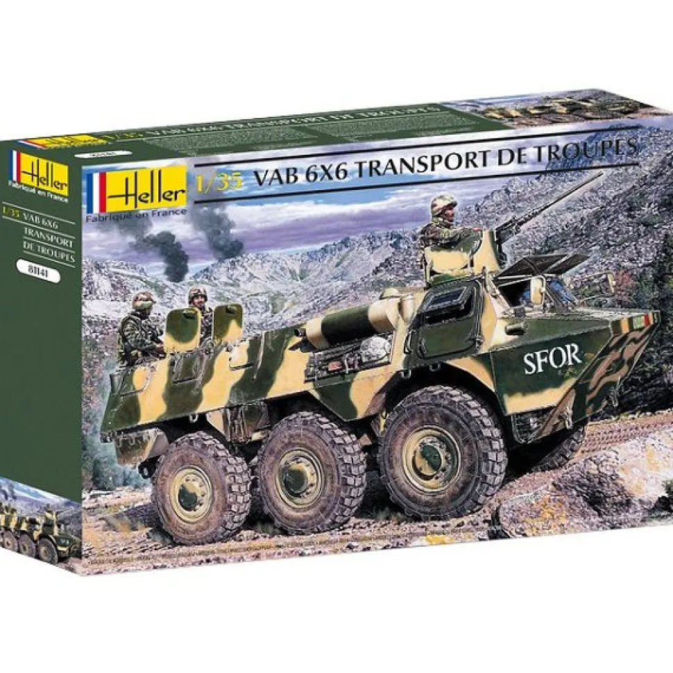 Longueur : 17.1 cm.Largeur : 7.2 cm. Hauteur : 8.2 cmNombre de pièces : 280.Peintures Humbrol recommandées : 11 19 23 33 34 53 55 66 72 85 94 103 119 1321 1322Plus de 5000 VAB (Véhicule de l’Avant Blindé) sont en service dans 14 pays de tous les continents. Ordinairement fabriqué en 4 x 4, seule configuration utilisée par l’Armée Française, le VAB est vendu à l’exportation souvent en configuration 6 x 6.
