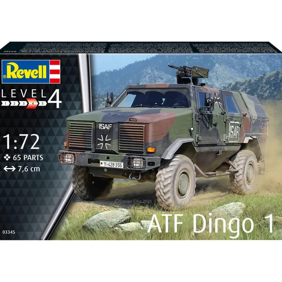 Maquette de véhicule blindée ATF Dingo 1 de la marque Revell. Contenu : 1 modèle en plastique à assembler de 65 pièces et 1 notice d’assemblage. Niveau de difficulté : 4/5. Dimensions de la maquette assemblée : 7.6 x 4 x 3.5 cm. Echelle : 1/72. Note : la colle et les peintures ne sont pas incluses dans le kit.