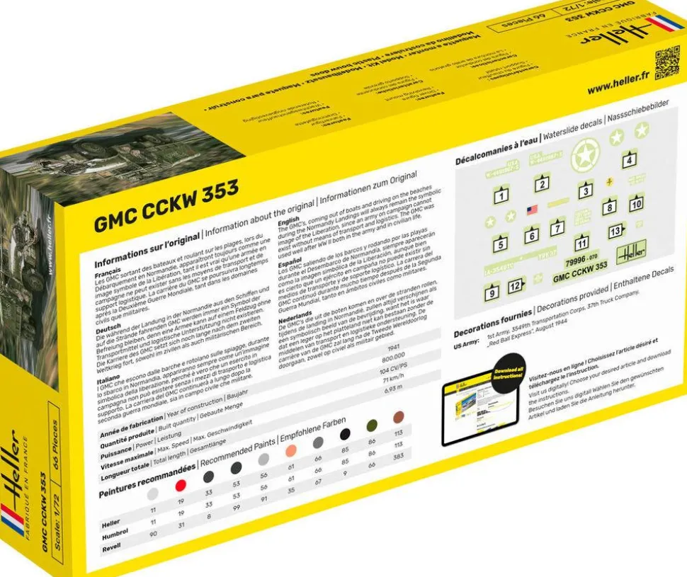 Maquette à assembler et à peindre d’un camion militaire modèle GMC CCKW 353 à l’échelle 1/72.Le GMC CCKW est un véhicule militaire américain de transport à trois essieux moteurs. Ce camion a été utilisé par l’armée américaine durant la Seconde Guerre mondiale et durant la guerre de Corée mais aussi par l’armée française durant la guerre d’Indochine et la guerre d’Algérie. Contenu du kit :- 1 maquette (66 pièces)- peintures principales- 1 pinceau – 1 colle – 1 plan de montageDimensions de la maquette : 9.6 x 3.3 cm.