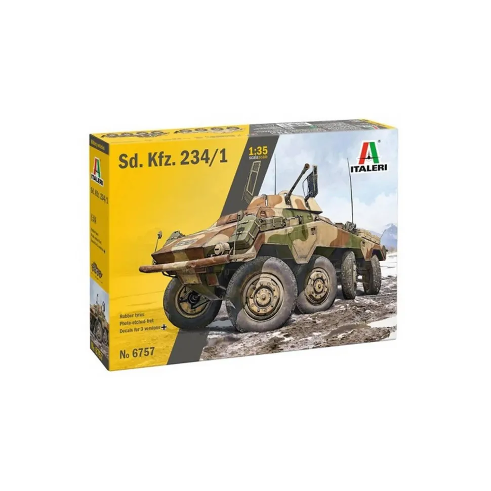 Construisez la maquette du véhicule militaire blindé Sd. Kfz. 234/1 en 1:35 de la marque Italeri!Les véhicules blindés de la série Schwerer Panzerspähwagen Sd.Kfz. 234 ont été produits par l’industrie de guerre allemande pendant la phase finale de la Seconde Guerre mondiale. Ils se distinguaient par leur grande qualité de fabrication, alliant mobilité, flexibilité opérationnelle et capacité offensive. Leur conception offrait un excellent équilibre entre vitesse tout-terrain, protection et puissance de feu, intégrant efficacement l’expérience opérationnelle acquise par la Wehrmacht au cours des premières années du conflit. Sur route, le véhicule pouvait atteindre une vitesse maximale de 85 km/h. Parmi les différentes versions produites, le Sd.Kfz. 234/1 servait souvent de véhicule de commandement. Également déployé dans des missions de reconnaissance avancée, il était équipé d’un canon KwK 30 de 20 mm monté dans une tourelle ouverte, capable de fournir un appui-feu à l’infanterie contre des cibles légèrement blindées.Echelle : 1:35Dimensions : 17,1 cmContenu : 3 versions de décalcomaniesColle et peinture non incluses