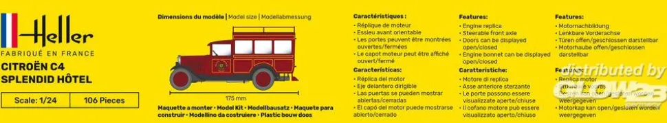 Maquette à assembler et à peindre : Citroën C4 Splendid Hôtel.Nombre de pièces : 106 pièces.Échelle : 1/24.Dimensions modèle: 17,7 x 6,6 cm.Dimensions boîte: 37 x 25 x 7 cmPeintures et colle vendues séparément.