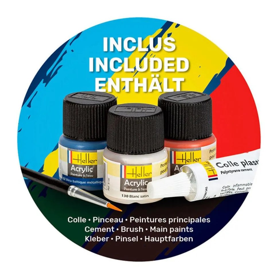 Kit Maquette Heller avec pinceau, colle et peintures.