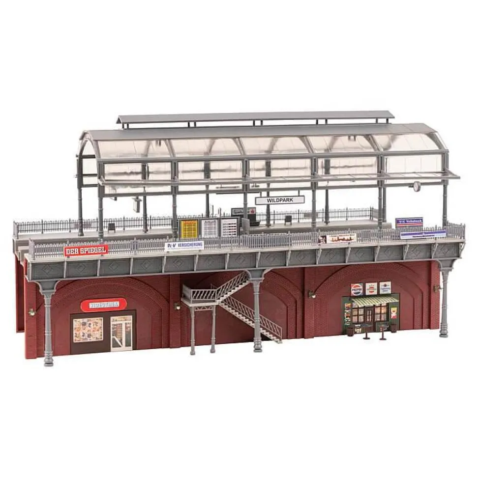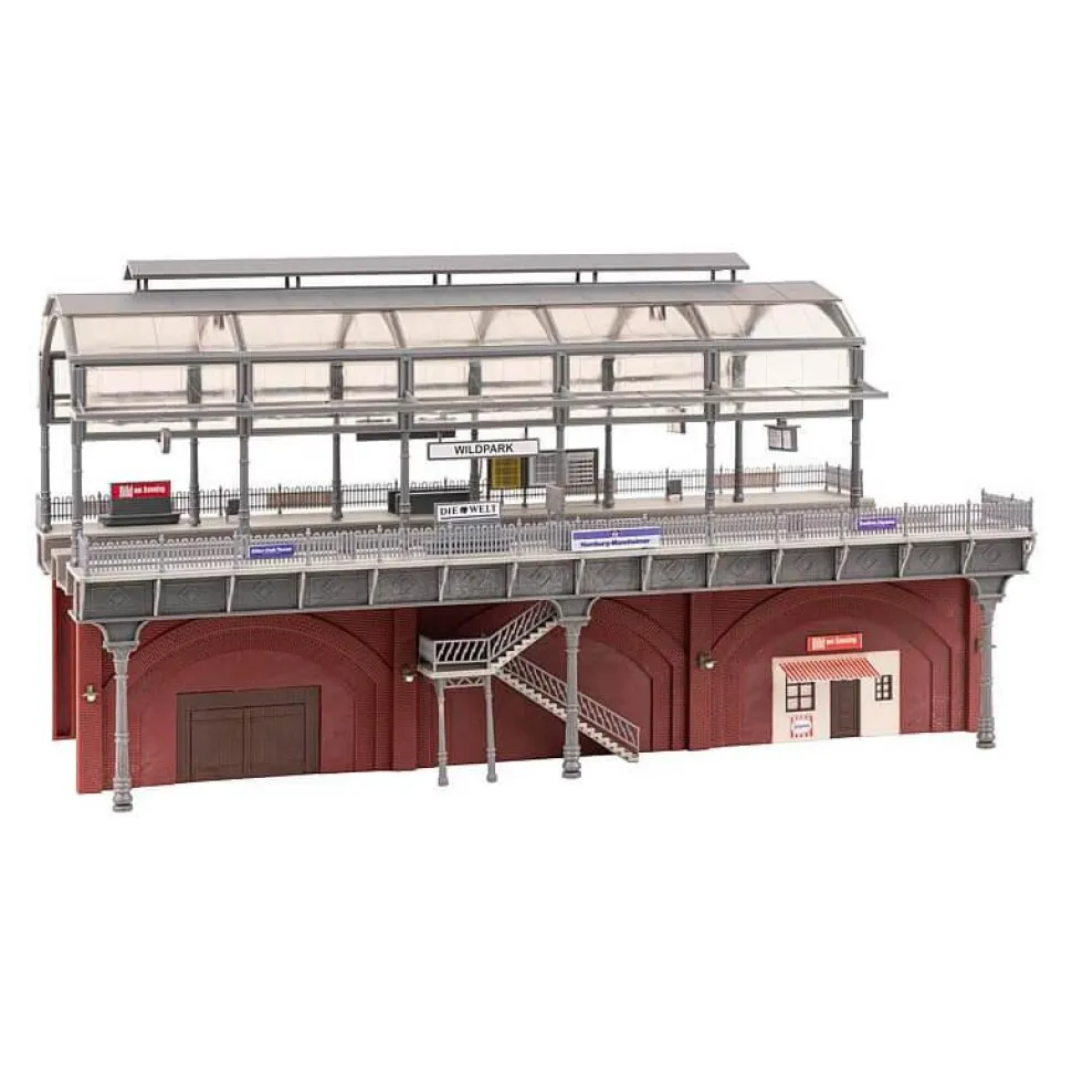 Kit de modélisme permettant de réaliser une station de RER à deux voies aménagée sur trois arches de viaduc avec montées d’escalier latérales, piliers décoratifs, chaperons et garde-corps en fonte ainsi qu’un toit en berceau vitré. Les voûtes en briques servent en partie d’espace utilitaire à des commerçants. Pour la décoration sont joints entre autres des panneaux d’information et des affiches publicitaires.