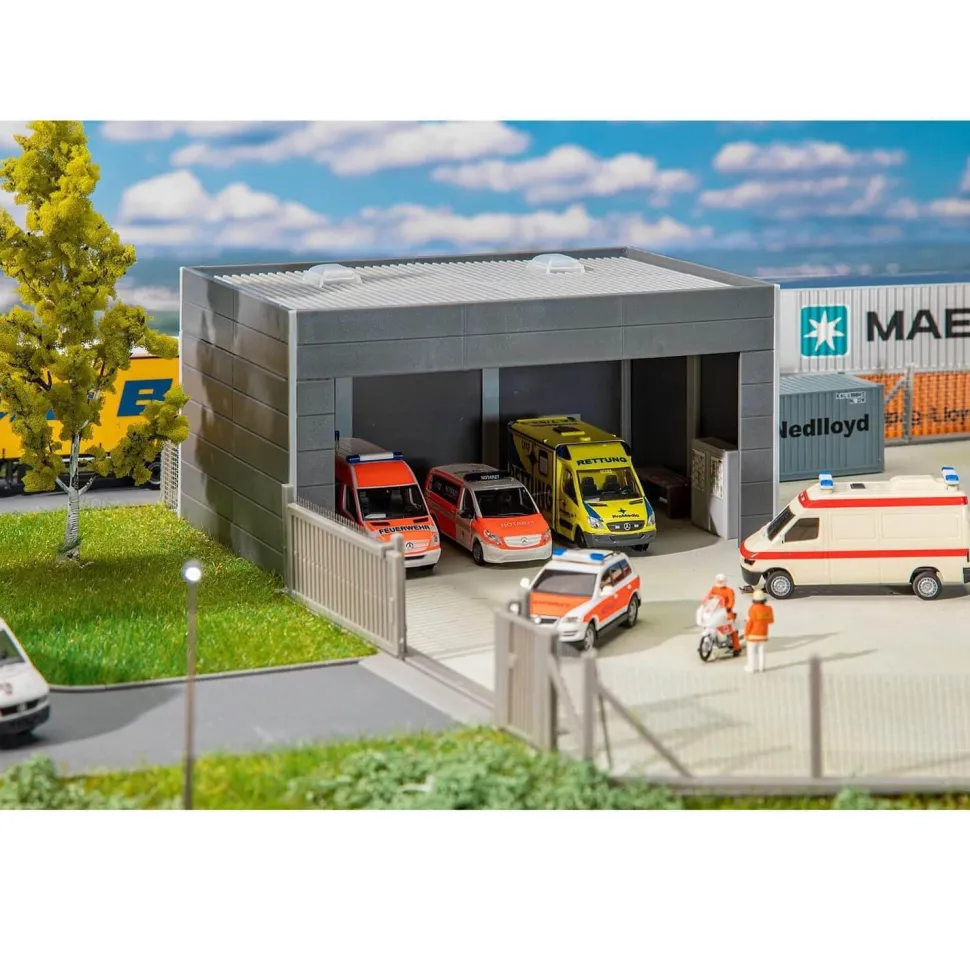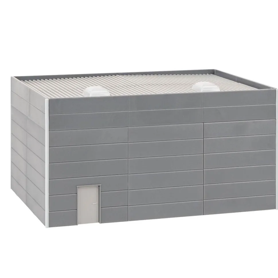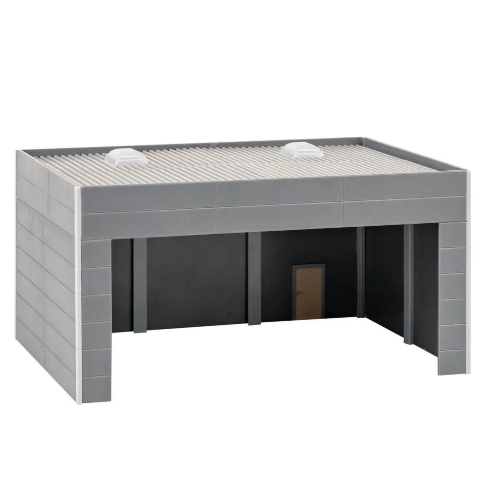 Système de construction. Abri ouvert pour deux véhicules avec deux vasistas et une porte à l’arrière. Compatible et extensible avec les éléments de la gamme FALLER Goldbeck.