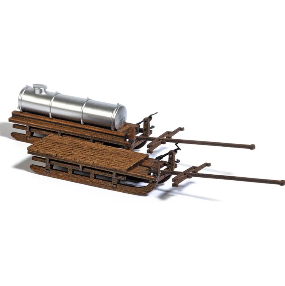 Busch 1631 vous propose ce kit de 2 traineaux de transport.Ces 2 traineaux de transport sont en bois véritable, déjà teinté, avec système de frein. Un traineau transporte une citerne.Echelle HO : 1:87