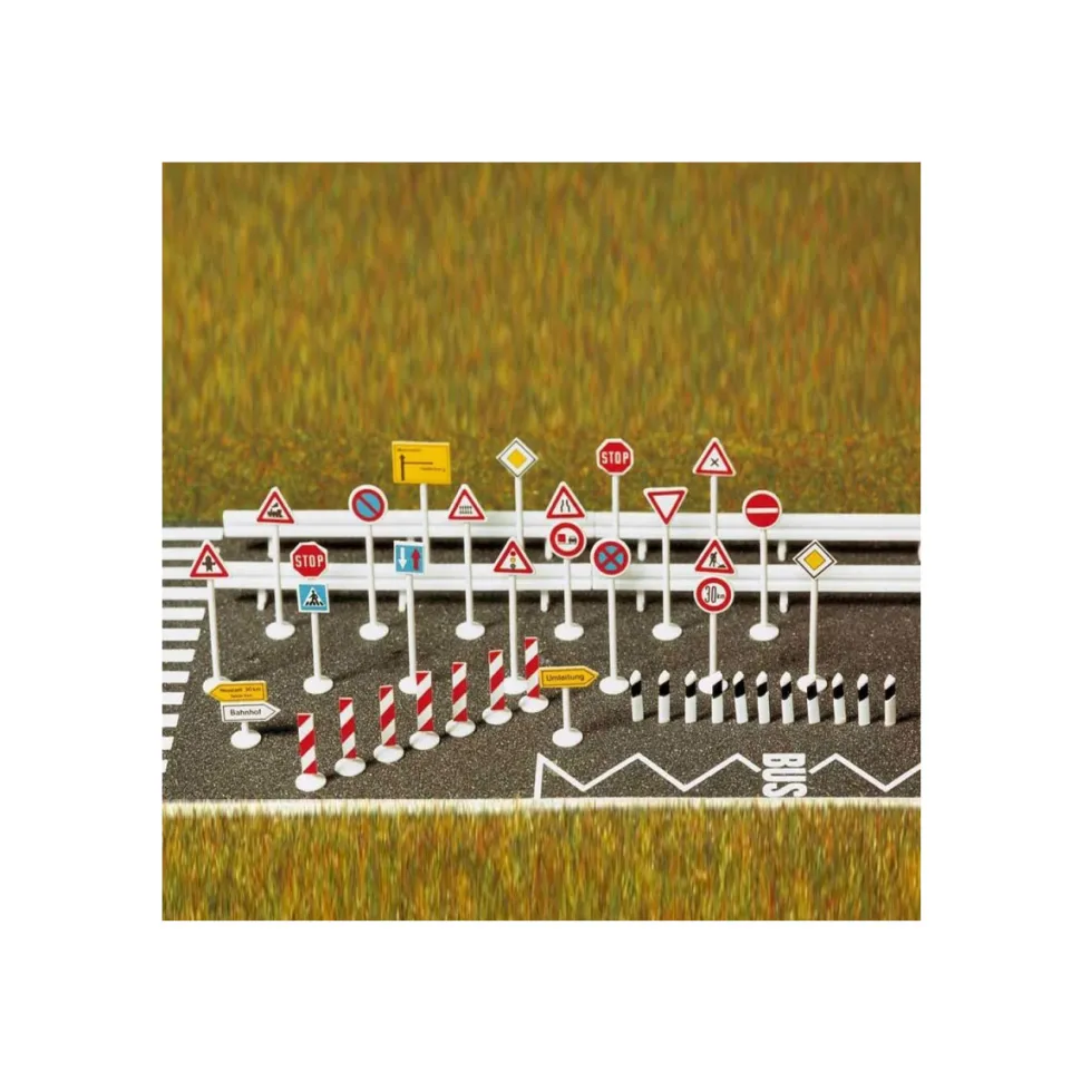 Busch 6027 vous propose ce set de panneaux de signalisation.Les panneaux de signalisation sont des éléments de la signalisation routière. Ils désignent à la fois le dispositif sur lequel est implanté un signal routier et le signal proprement dit. Placés sur le côté des routes, ils ont pour fonction de rendre plus sûre la circulation routière en informant les usagers d’éventuels dangers qu’ils peuvent rencontrer, de faciliter cette circulation, en indiquant par exemple les directions à suivre …Dans ce set, quelques panneaux sont en allemand.Echelle HO (1/87)