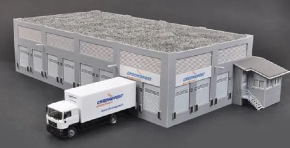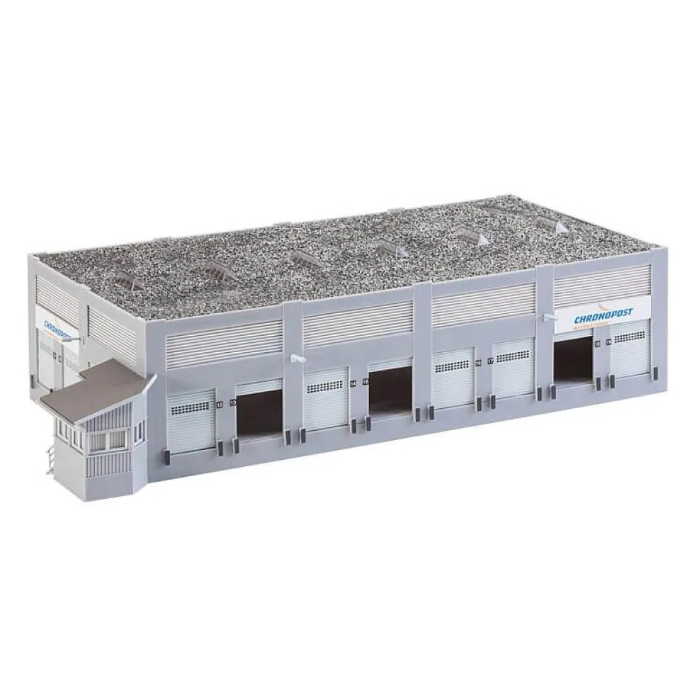 Centre moderne d’entreposage, de transbordement et de gestion de l’entreprise logistique « Chronopost », à un étage. Ce parallélépipède fermé au toit plat garni de gravier est équipé de 19 portes à glissière au total devant permettre l’entrée et l’enlèvement de la marchandise. L’éclairage du centre est assuré par des vasistas et une rangée de fenêtres sur tout le pourtour.Modèles spéciaux France.Échelle : HO.Dimensions : 376 x 200 x 91 mm.