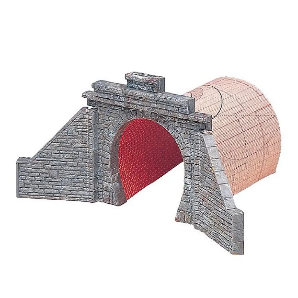 1 rail. Murs d’aile pliables.Avec plaque murale pour l’entrée de tunnel et des pièces de mur supplémentaires.Epoque : 1880 – 1920.Hauteur libre : max 72 mm. Nombre de pièces : 5.