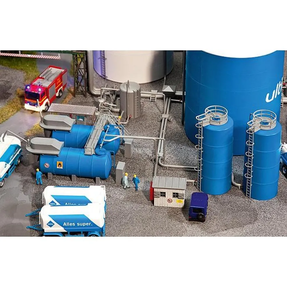 Petite installation de réservoirs ARAL avec deux cuves allongées et trois cuves debout, accessibles par des escaliers et des plateformes. Le transport se fait par des tuyaux. Avec puisage et une petite hutte en bois.Ce kit de montage contient: 477 pièces détachées dans 5 couleurs, pièce pour fenêtre, 1 déco et 1 notice de montage.Utilisez pour le bricolage FALLER – colle plastique.Epoque : 1986 – 2006.Degré de difficultés : standard.Dimensions de la cuve, position horizontale : 150 x 107 x 56 mm.Dimensions de la cuve : 68 x 50 x 57 mm.Dimensions de la cuve, position verticale : 51,5 x 43 x 105 mm (2 x).Dimensions immeuble : 63 x 23 x 28 mm.Dimensions baraque : 43 x 27 x 30 mm.