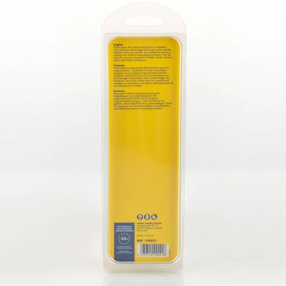 Outil d’ébavurage particulièrement fin pour les maquettistes . La pointe en acier inoxydable équipée d‘une poignée ergonomique permet d’aplanir facilement les bavures d’injection ou de moulage indésirables sans endommager les surfaces. Peut être utilisé pour les carottes de modèles en plastique, les pièces photogravées et les miniatures en métal.
