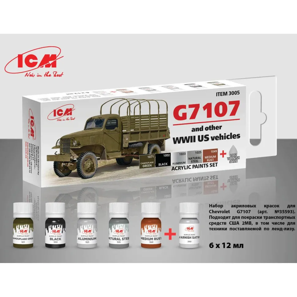 Set de 6 Peintures acryliques pour maquette de véhicule militaire américain de la Seconde Guerre Mondiale, de la marque ICM. Contenance : 12 ml.