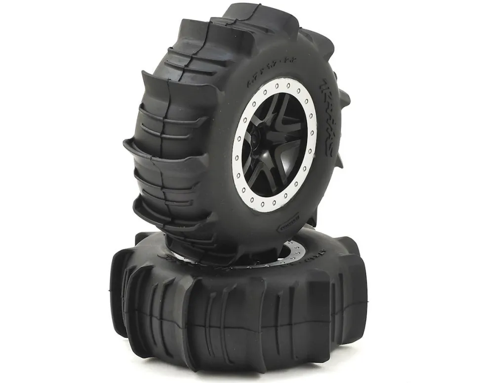 Caractéristiques détaillées : Pneus + Jantes Satin Chrome Beadlock Style Pneus Pelle (2) – Traxxas