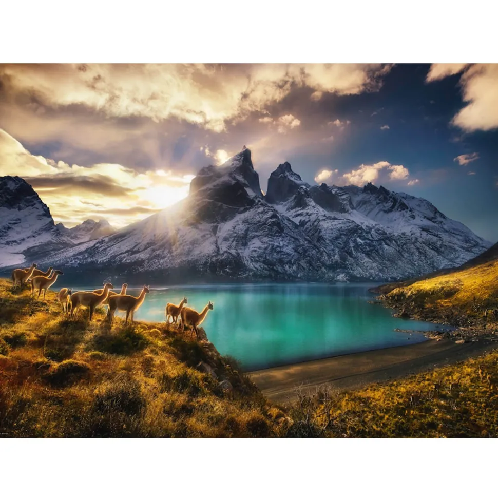 Partez à la rencontre des guacanos, les lamas sauvages d’Amérique du Sud, à travers ce puzzle ! L’image à reconstituer pièce après pièce est une photographie prise au lever du soleil d’un groupe de guacanos sur les hauteurs avec en arrière-plan un lac et une chaîne de montagnes enneigées.
