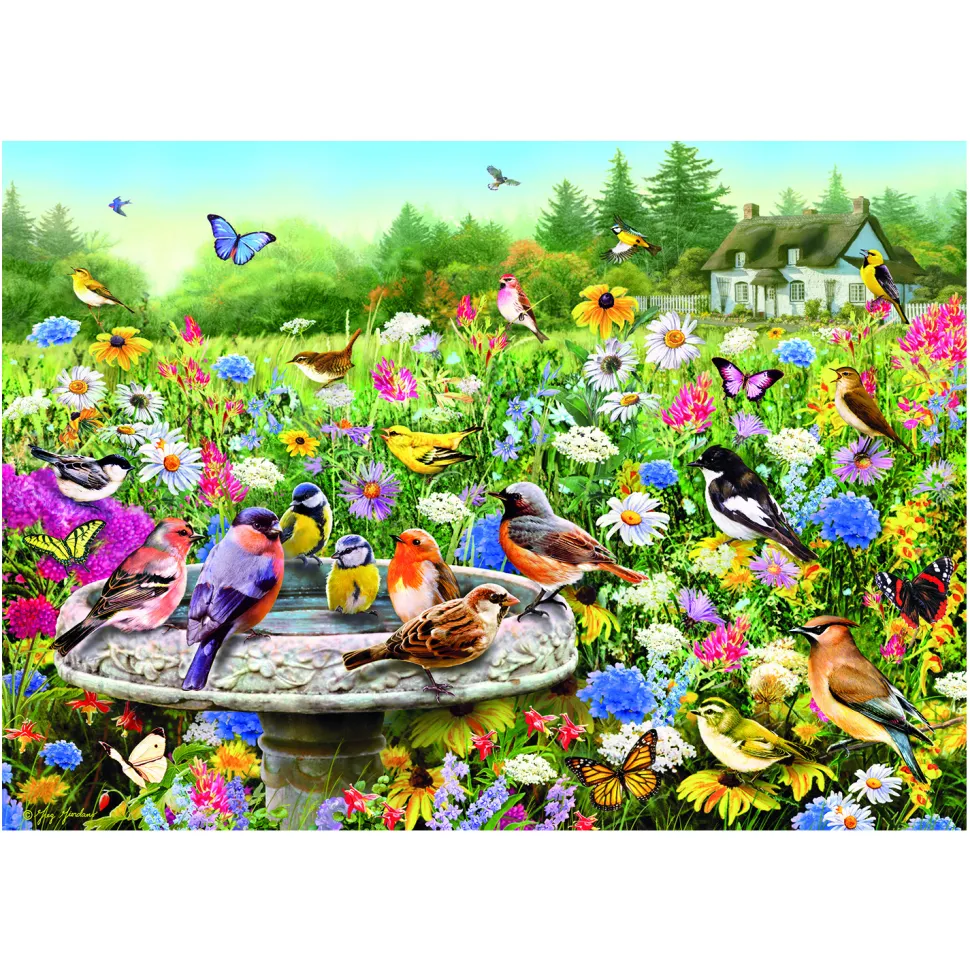 Voici un jardin de maison de campagne très fleuri accueillant de nombreuses espèces volantes ! Les oiseaux et les insectes adorent les fleurs et aiment s’y retrouver. De plus, cette petite fontaine au centre de ce parterre leur permet de se désaltérer et se rafraichir. Cet ensemble coloré et aux nombreux détails donne un effet plus vrai que nature ! Ce puzzle est constitué de 1000 pièces. Une fois assemblé, il devient un super tableau paysage de 68 cm par 49 cm. Cette même illustration est également disponible sur notre site en version 500 pièces (Gibsons-G3406) et 100 pièces XXL (Gibsons-G2210).
