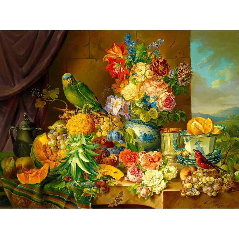 Caractéristiques détaillées : Puzzle 1000 Pièces : Josef Schuster – Nature morte avec des fleurs fruitées et un Perroquet
