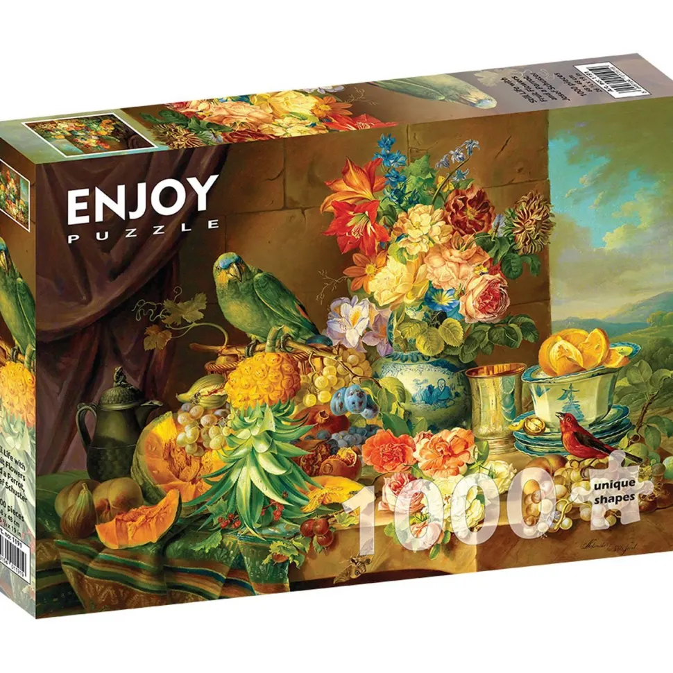 Description du produit : Puzzle 1000 Pièces : Josef Schuster – Nature morte avec des fleurs fruitées et un Perroquet