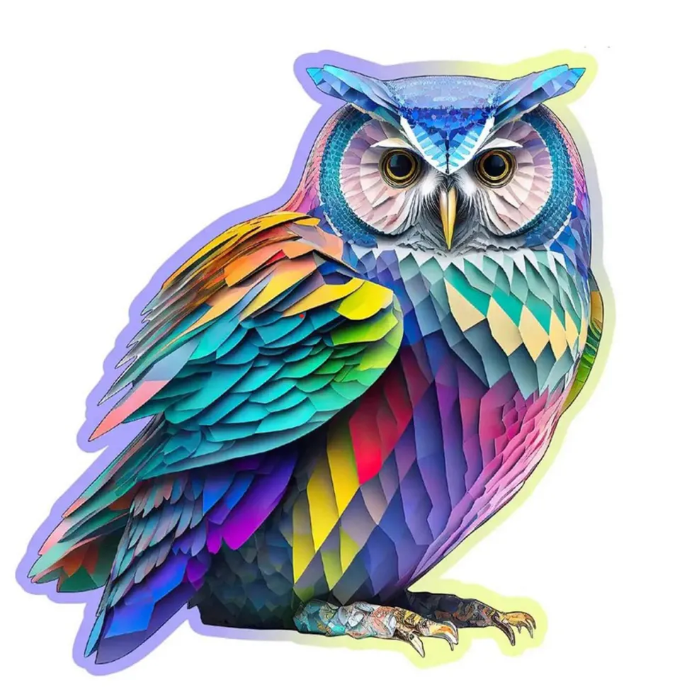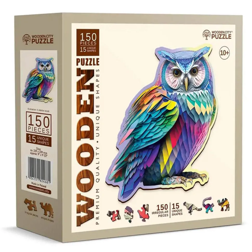 Description du produit : Puzzle 150 pièces/15 formes en bois : chouette colorée