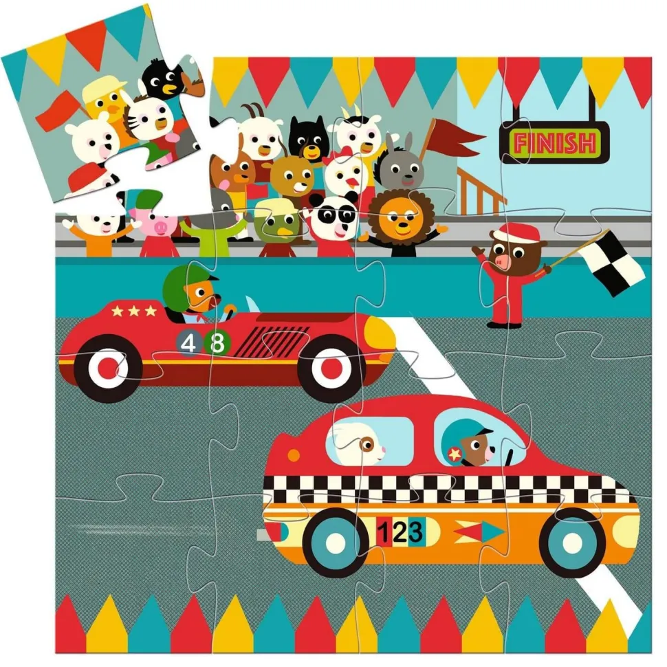 Reconstruisez le Puzzle 16 pièces : le bolide, de la marque Djeco.