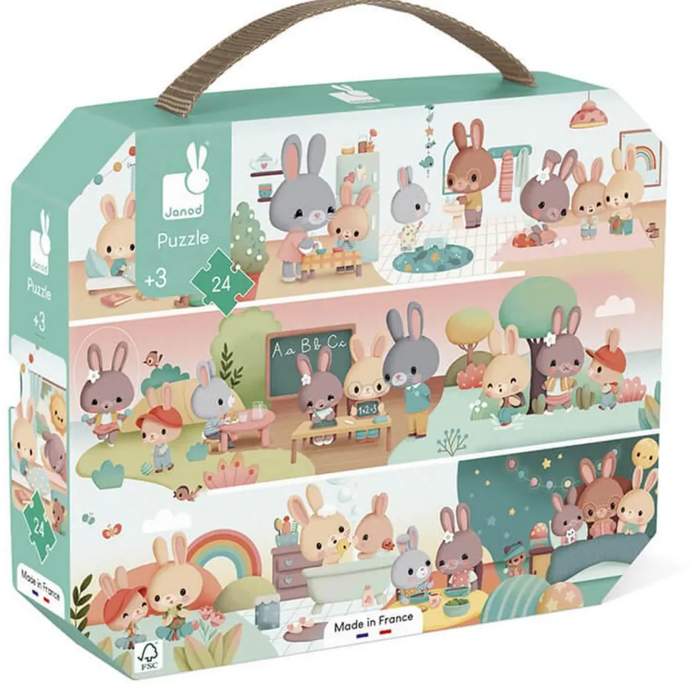 Suivez les aventures de cette adorable famille de lapins au quotidien ! Ce joli puzzle en carton de 24 pièces aidera votre enfant à se repérer dans le temps et à identifier les petits rituels du quotidien : se lever, s’habiller, puis partir à l’école et jusqu’à l’heure du couché. Un très bon support pour apprendre, partager et développer la motricité des petits.
