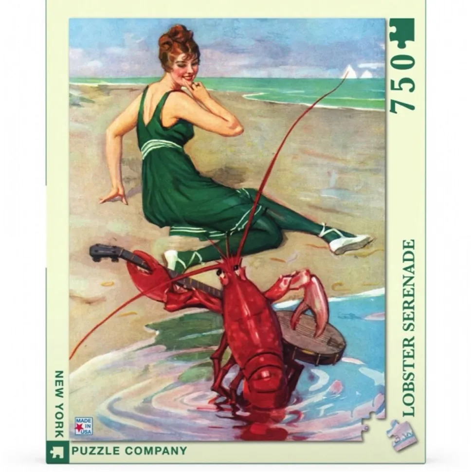 Ce puzzle de la New York Puzzle Company présente une couverture de magazine vintage représentant une femme se faisant bercer par un homard très musical.
