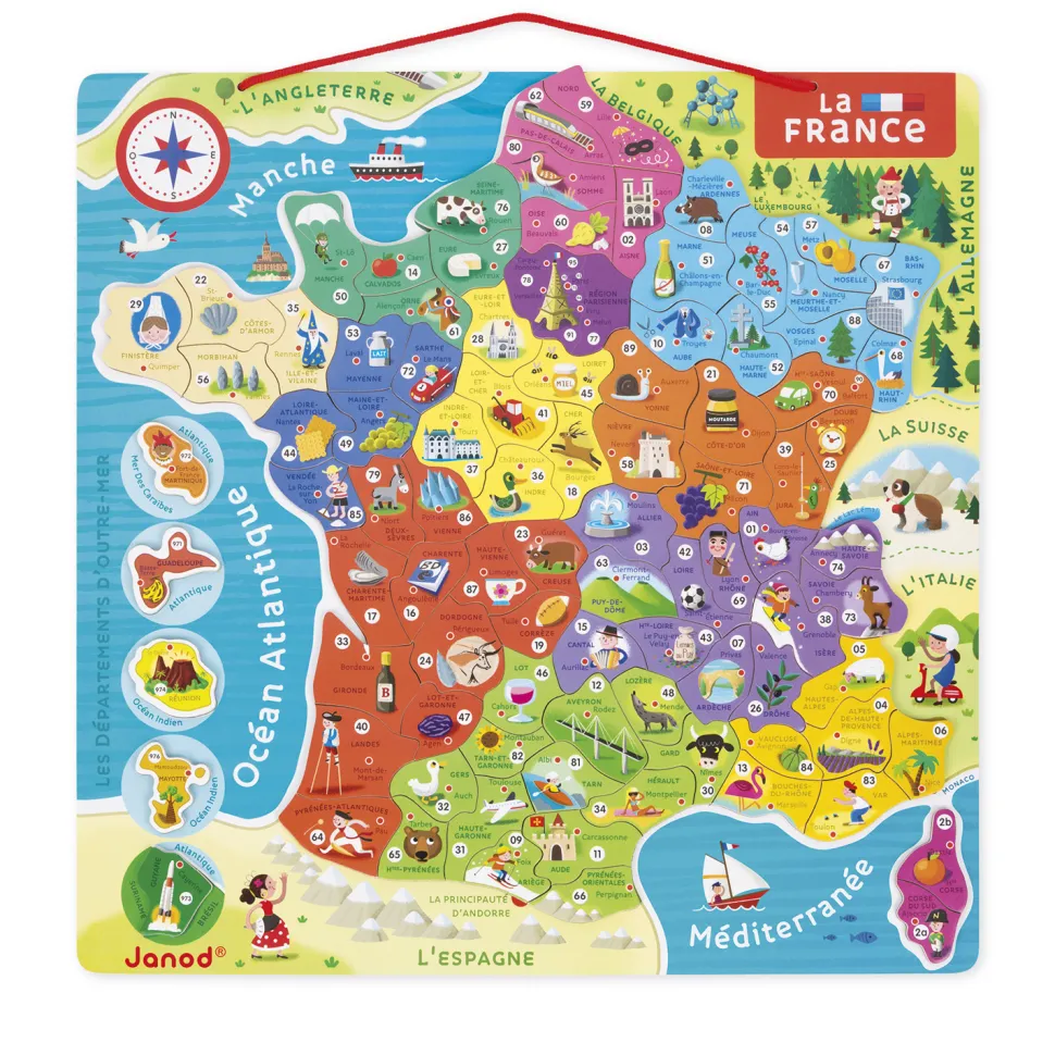 Faites le tour de France en 93 magnets ! Conçu pour les enfants de 7 à 12 ans, ce puzzle magnétique en bois a pour vocation d’apprendre la géographie tout en s’amusant. Chacun des magnets prend la forme d’un département français (DOM inclus). Le nom et le numéro apparaissent bien en évidence sur le recto des pièces, de même que le chef-lieu et une spécialité locale sous forme d’illustration. Le tableau magnétique destiné à accueillir les 93 pièces présente quant à lui les 12 nouvelles régions, mais aussi les grands fleuves, les principaux massifs montagneux, les pays frontaliers et les mers qui bordent le territoire. Une solide ficelle permet de suspendre le tableau au mur de la chambre ! Grâce à ce puzzle en bois magnétique, les départements et leurs spécialités n’auront plus de secrets pour vous ! Dimensions du tableau : 36 x 36 x 1 cm.