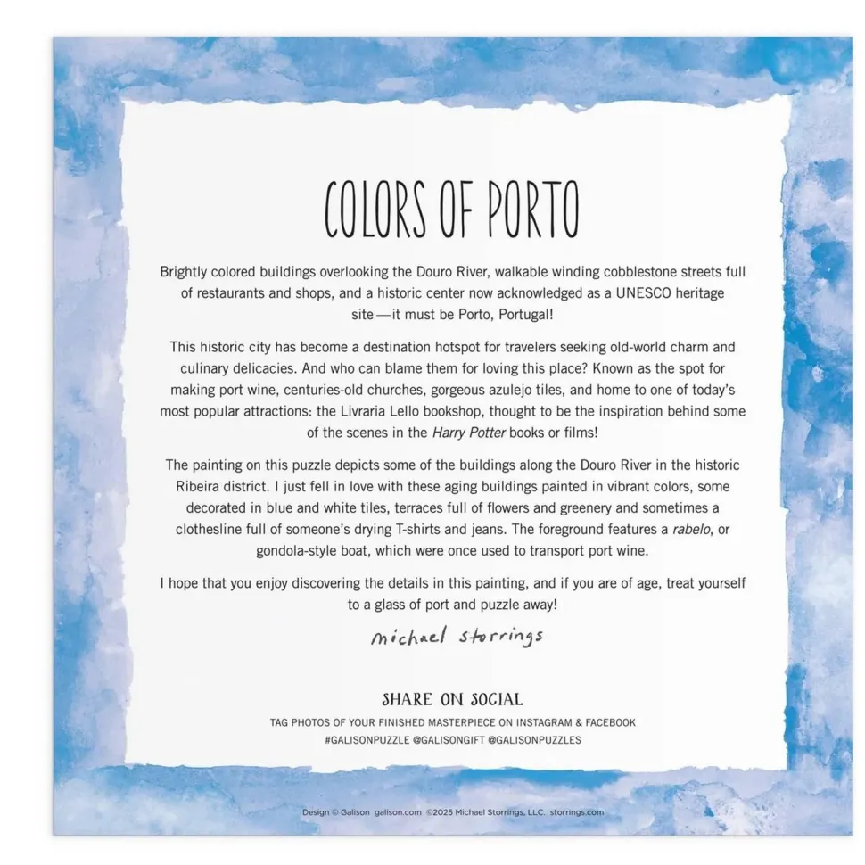 Puzzle 500 pièces de la marque Galison Couleurs de porto de l’artiste Michael Storrings