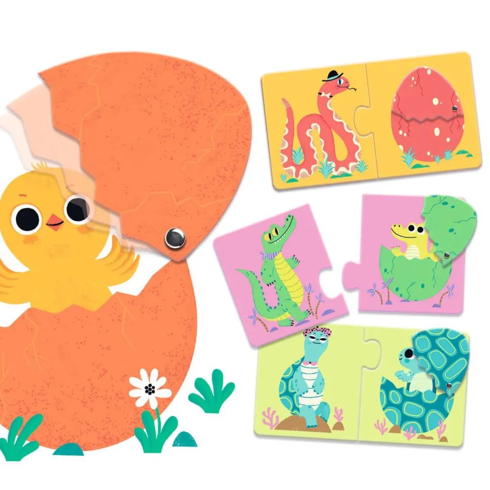 Un puzzle éducatif animé où l’enfant associe l’animal à son œuf, puis découvre le bébé caché à l’intérieur : surprise !
