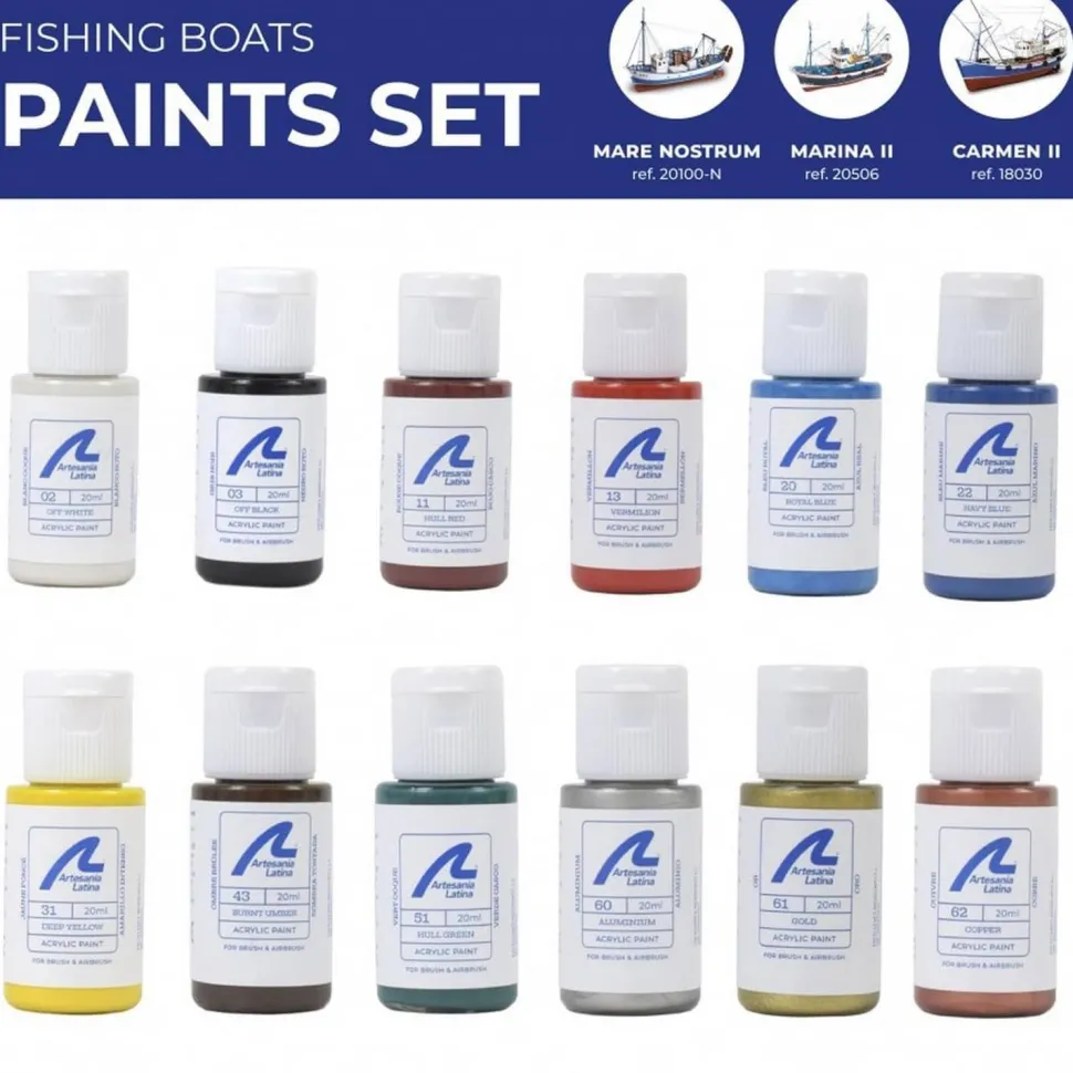Set de 12 Peintures pour Maquette Bateau de pêche (Carmen, Marina II et Mare Nostrum) de la marque Artesanía Latina.