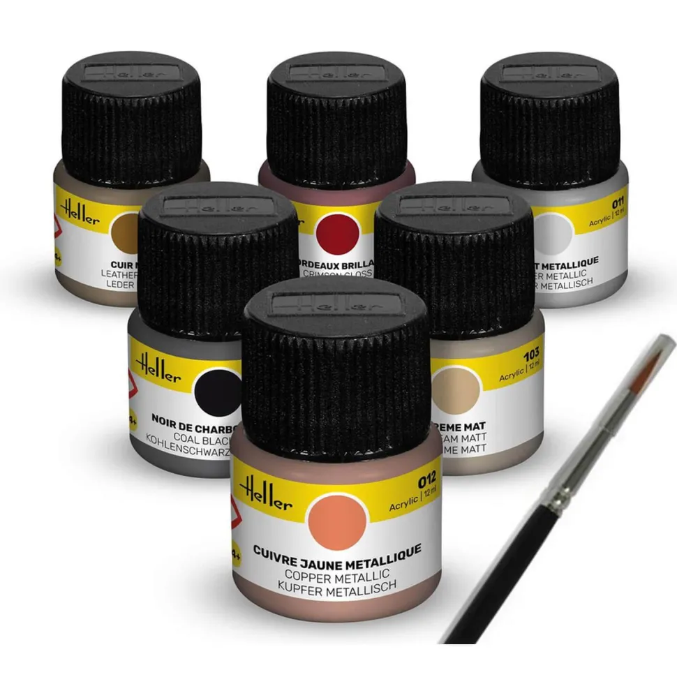 Ce kit de la marque Heller contient six couleurs acryliques de 12 ml et un pinceau.