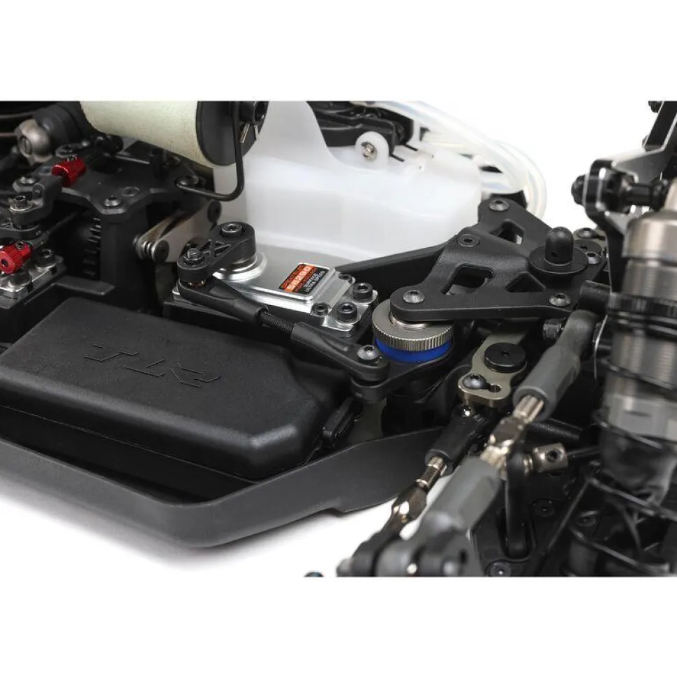 Le support du différentiel central est une nouvelle pièce composite moulée offrant plus de rigidité et le nouveau support intégré pour le servo de l’accélérateur est plus léger. Le côté buggy E sera géré en utilisant une mise à jour du différentiel central du 8XT.