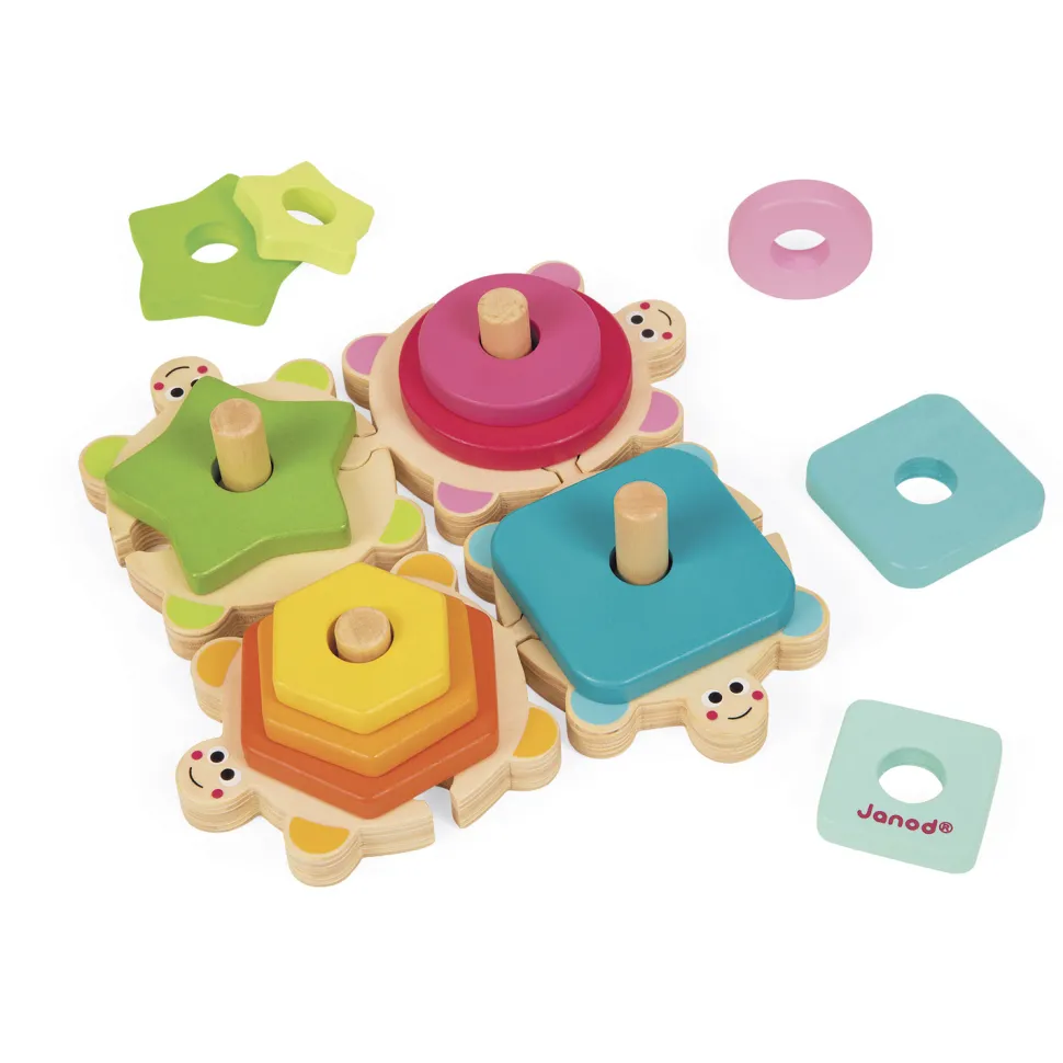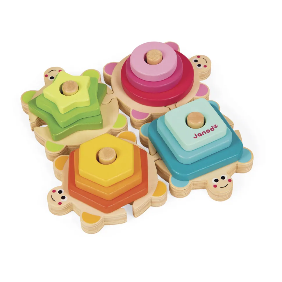 4 tortues rigolotes avec 12 pièces colorées à empiler. Idéal pour apprendre les formes et les couleurs et aider bébé à développer la coordination entre ses mains et ses yeux. Les 4 tortues peuvent se détacher ou s’attacher très facilement entre elles. Jouet peint à l’eau.Produit labellisé FSC : les bois utilisés pour sa fabrication proviennent de forêts gérées de manière responsable.